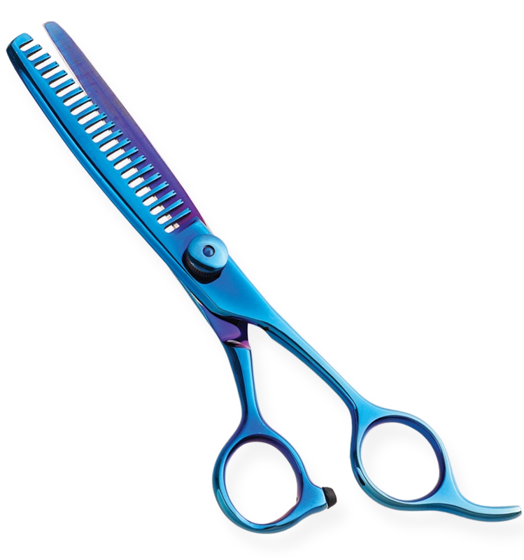 Professional Razor Edge Blue Titanium Coated Thinning Scissor, Movable Screw with Fixed Finger Rest. Available Sizes. 4 in, 4.5 in Details. Razor Edge thinning scissors made of Japanese stainless steel J/2 – 420, HRC° (hardness) 52° – 55°. Also available in 440C HRC° (hardness) 60° – 65°. Available in fix, limitation, adjustable and hand adjustable screws with and without leaf spring.